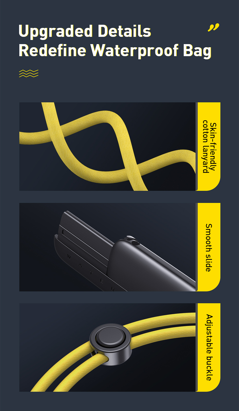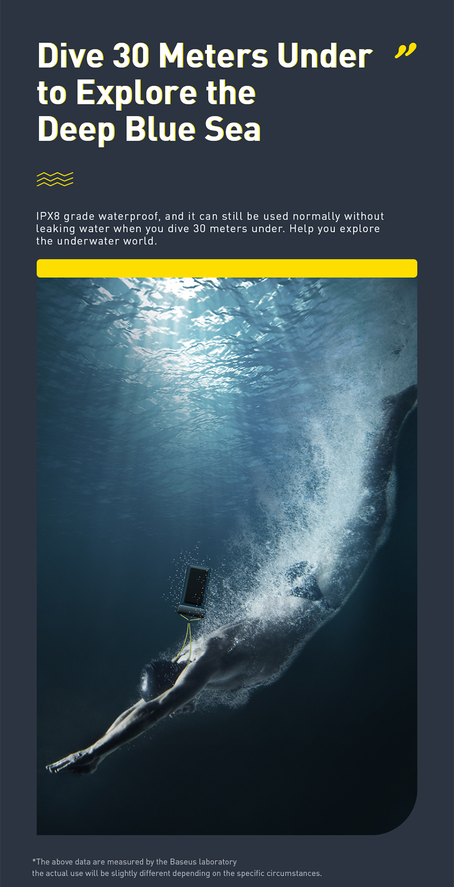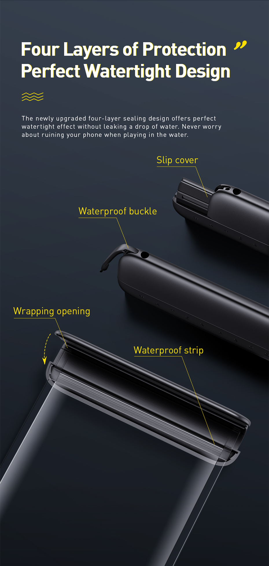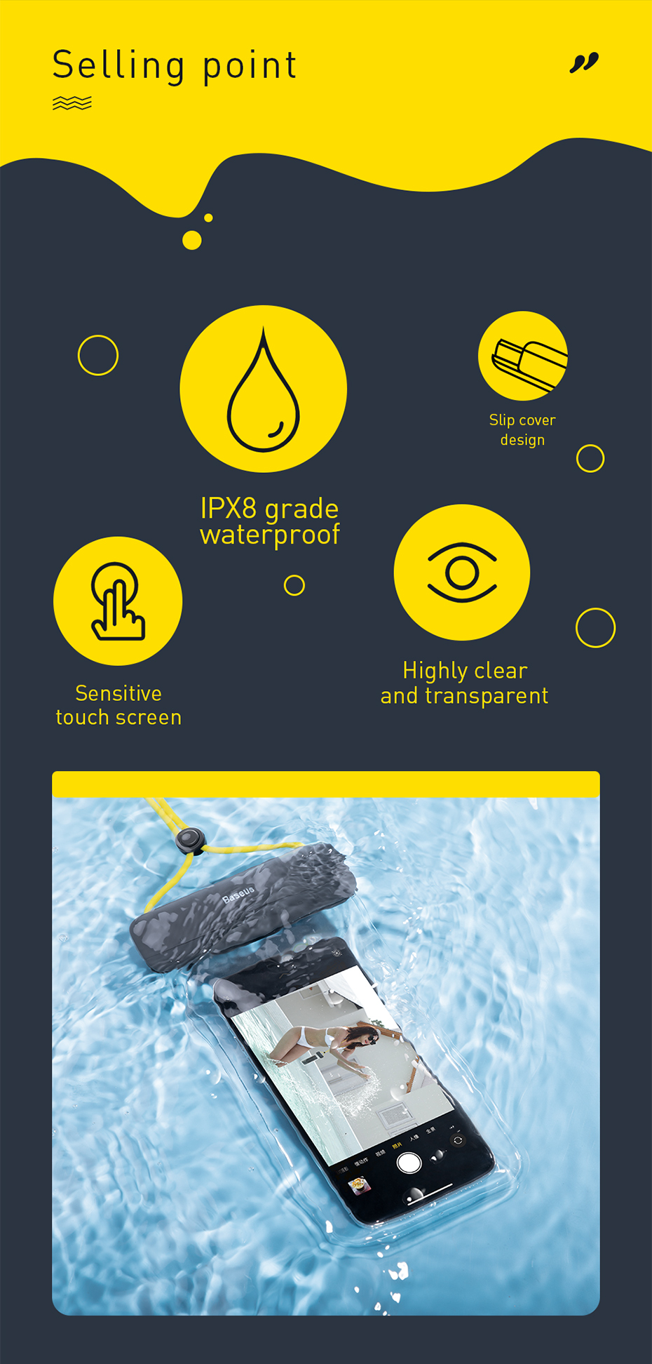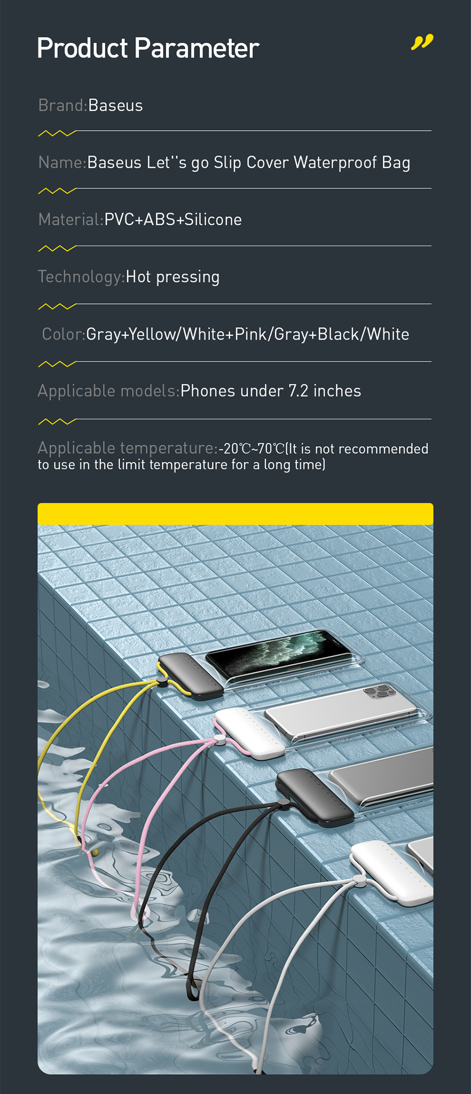 Đừng để nỗi lo điện thoại bị ướt làm gián đoạn cuộc vui của bạn! Với túi chống nước Baseus Let's go, bạn có thể tự tin mang theo dế yêu trong mọi hoạt động dưới nước, từ bơi lội, lặn biển cho đến những ngày mưa bất chợt, đảm bảo an toàn tuyệt đối.