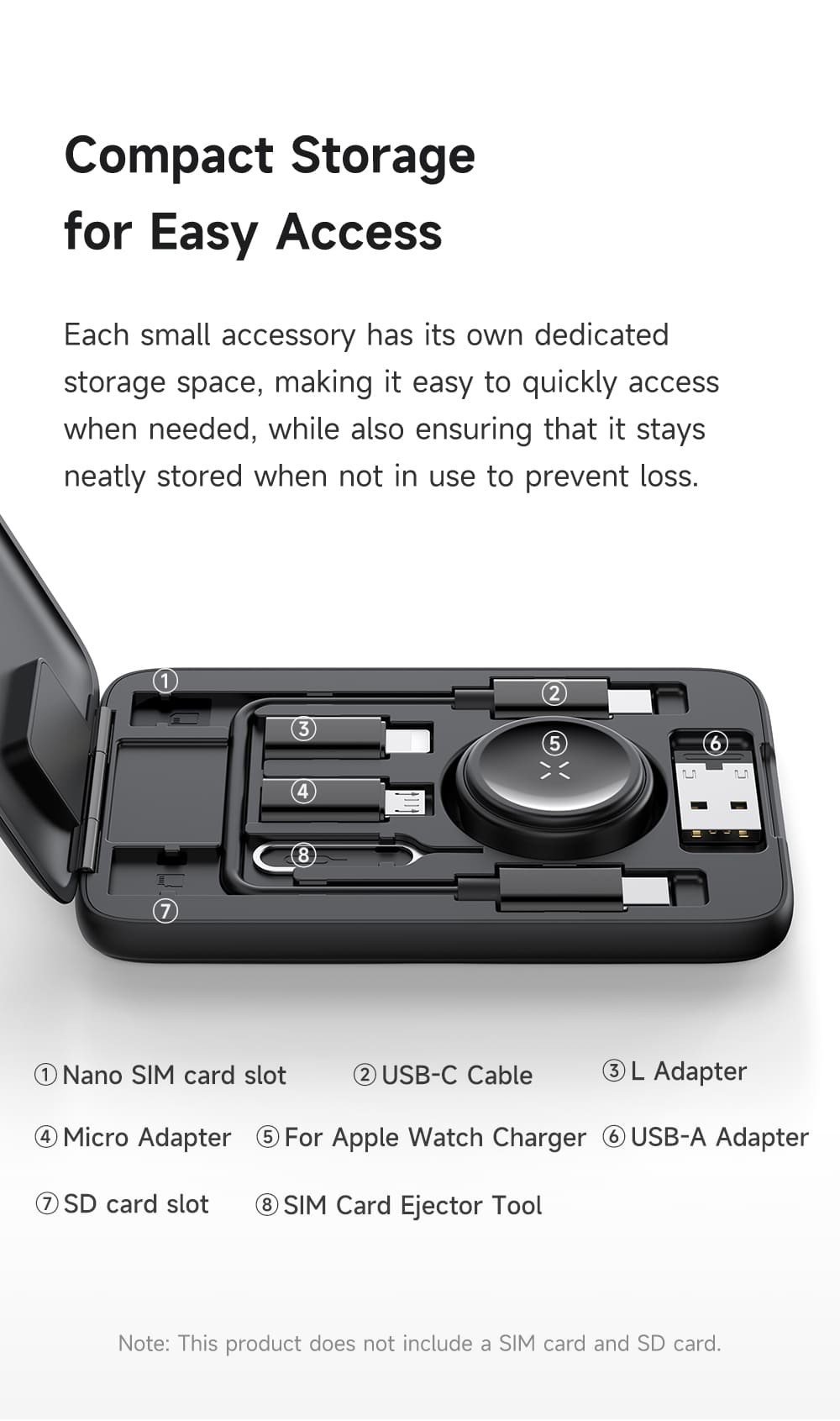 ✈️ Trọn Bộ Công Cụ Cần Thiết Cho Du Lịch: Gói gọn mọi thứ bạn cần trong một chiếc hộp siêu mỏng: cáp sạc Type-C, các đầu chuyển đổi (USB, Ln, Micro), que chọc SIM, khe chứa thẻ nhớ/SIM... Mọi thứ đều được sắp xếp ngăn nắp, dễ dàng truy cập.