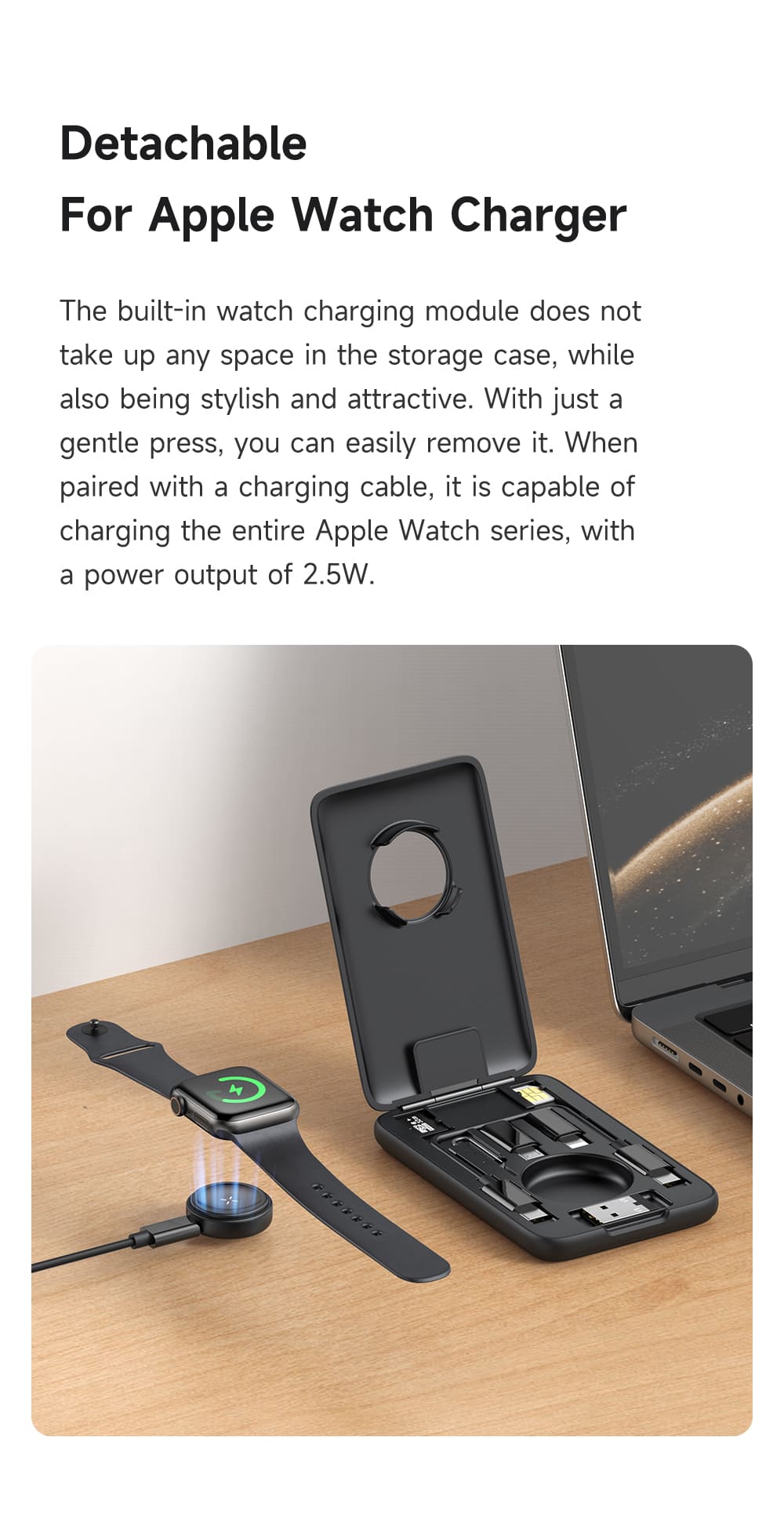 ⌚️ Tích Hợp Đế Sạc Đồng Hồ Thông Minh Có Thể Tháo Rời: Điểm độc đáo nhất! Bộ sản phẩm đi kèm một đế sạc không dây cho đồng hồ thông minh. Bạn có thể sử dụng nó ngay trong hộp hoặc tháo rời để cắm vào củ sạc, laptop một cách linh hoạt.