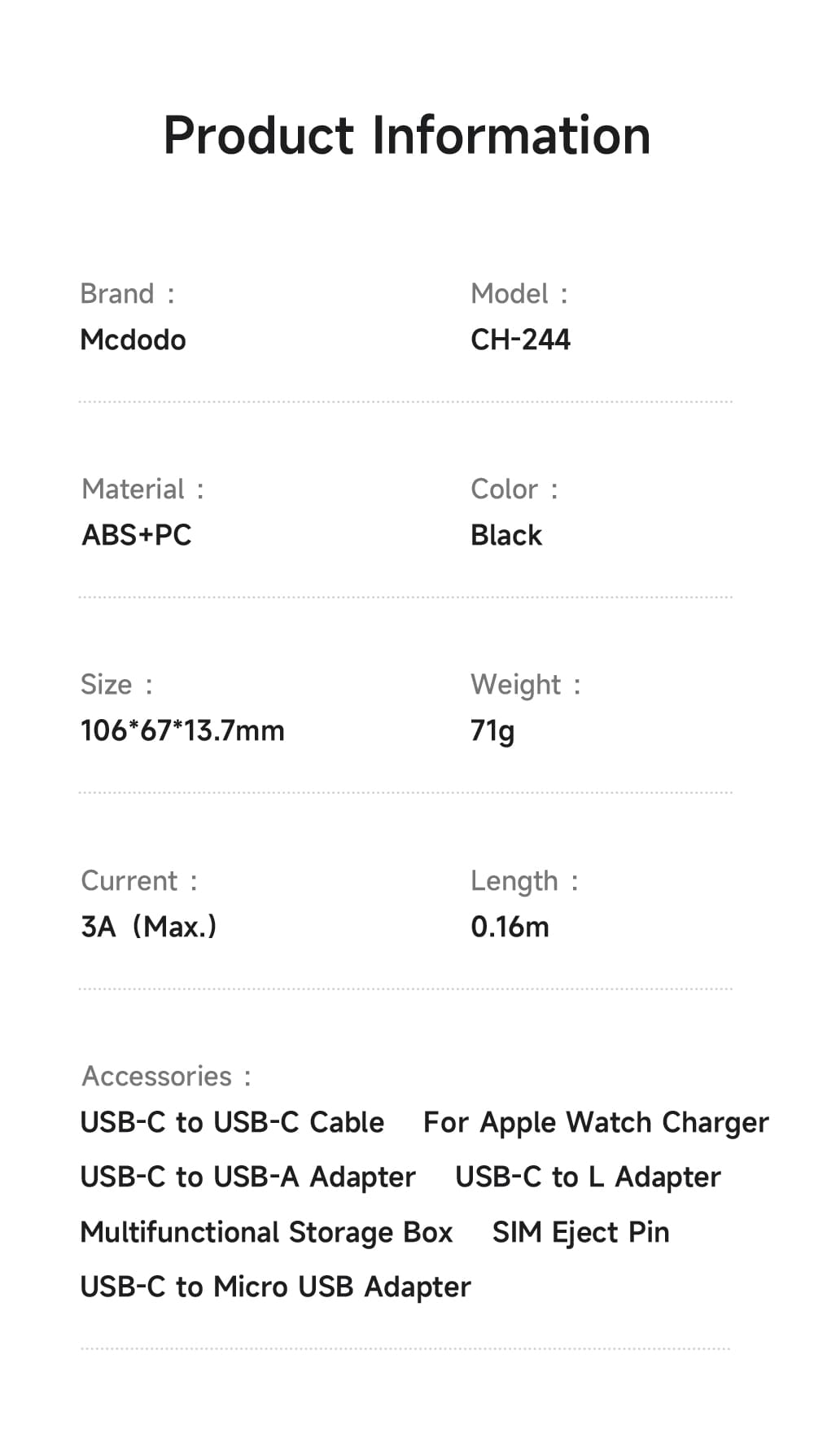 | Bộ sản phẩm bao gồm | Cáp Type-C to Type-C Đế Sạc đồng hồ Đầu chuyển Type-C to USB Đầu chuyển Type-C to iP Đầu chuyển Type-C to Micro Hộp đựng Khe chọc sim |