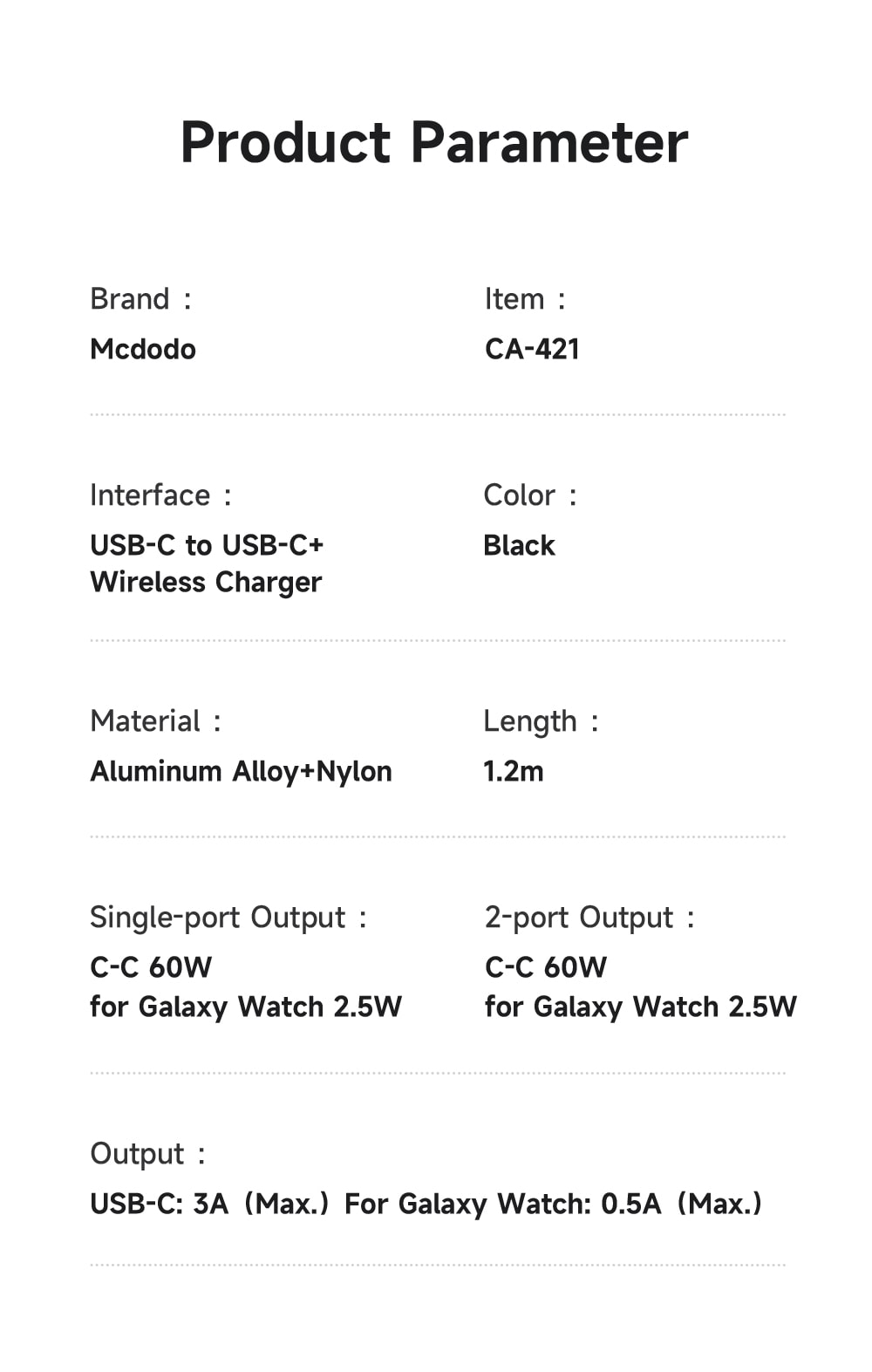 | Tên | Cáp Sạc Đa Năng Mcdodo 2-in-1 C to C+ Samsung Watch Wireless Charge 60W |