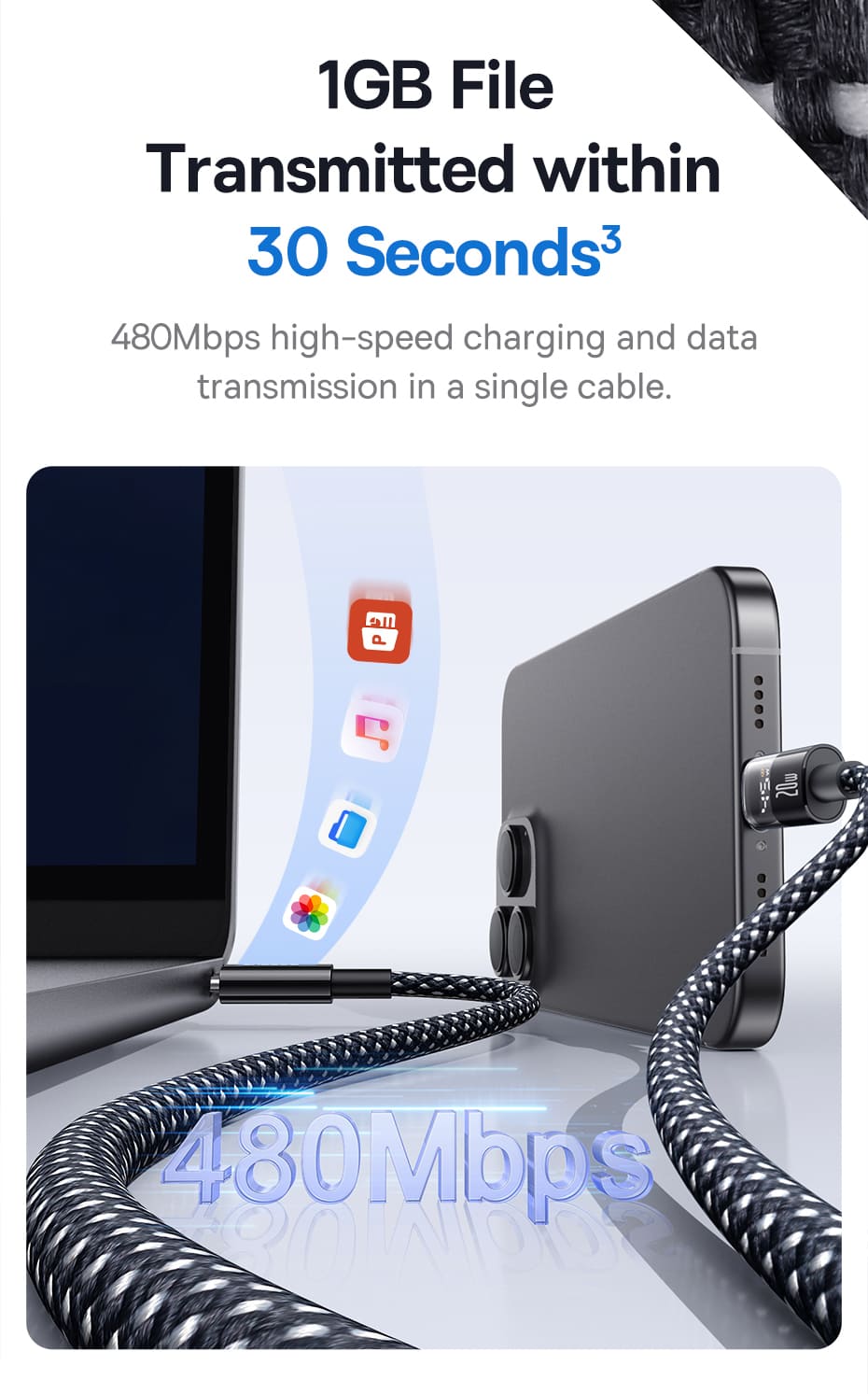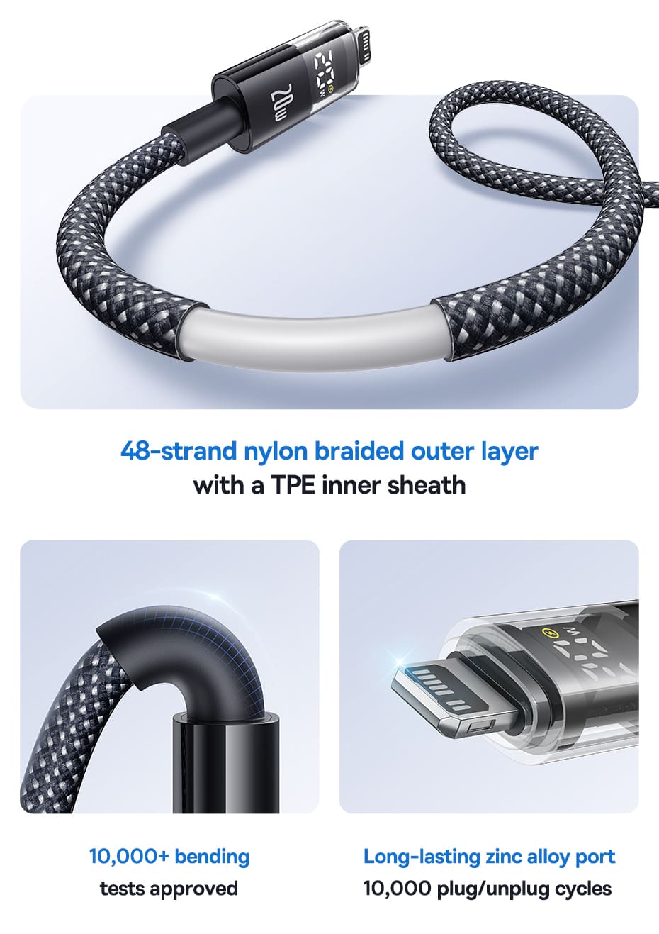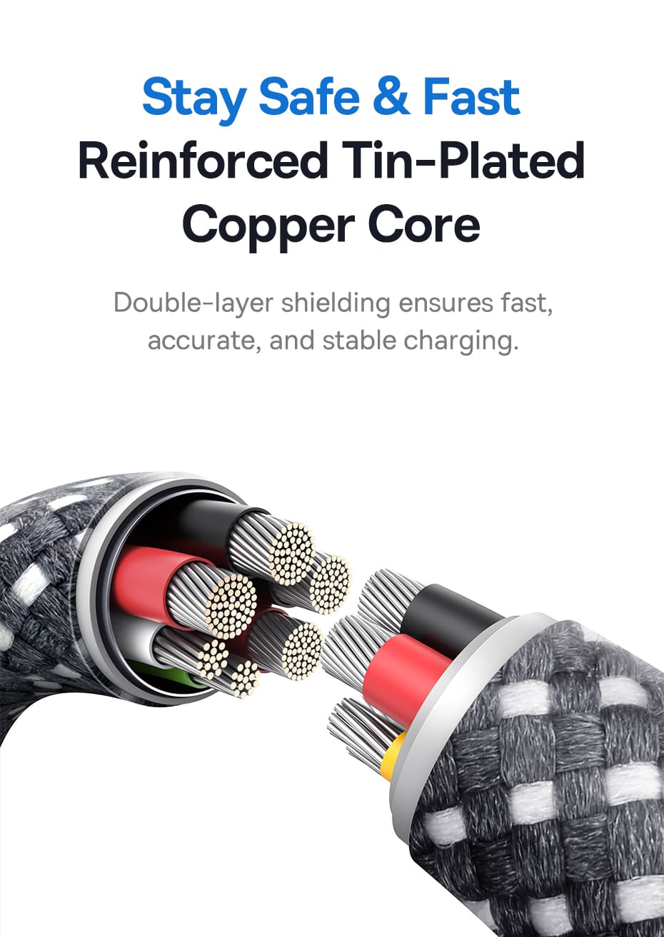💪 Bền Bỉ Vượt Trội Với Dây Dù Bện: Vỏ cáp được bện từ sợi nylon mật độ cao, đầu cắm làm từ hợp kim kẽm chắc chắn. Cấu trúc này không chỉ mang lại vẻ ngoài cao cấp mà còn giúp cáp siêu bền, chống rối và chống đứt gãy hiệu quả.