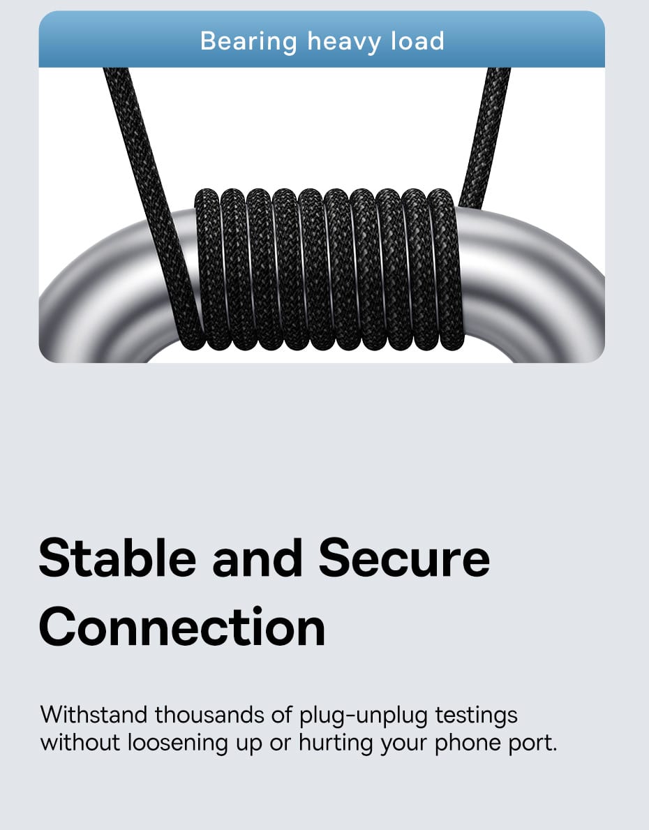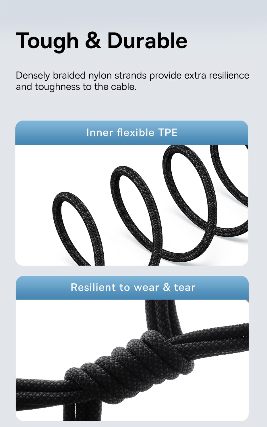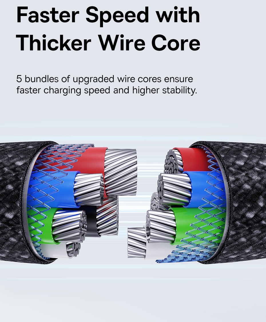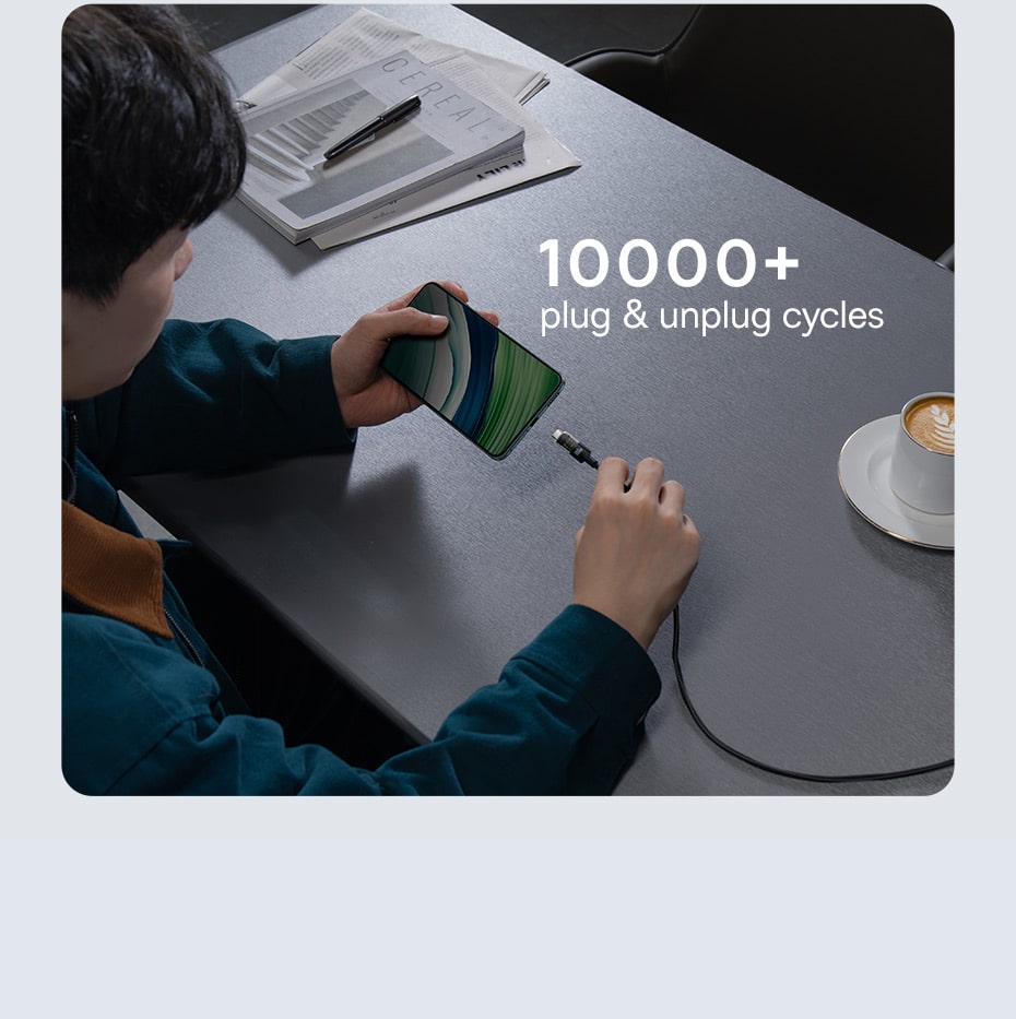 💪 Bền Bỉ & Ổn Định: Dù có thiết kế tinh tế, cáp vẫn đảm bảo độ bền với các khớp nối được gia cố và lõi đồng dày. Cấu trúc chắc chắn giúp chịu được các tác động uốn cong hàng ngày và đảm bảo dòng điện luôn ổn định, an toàn.