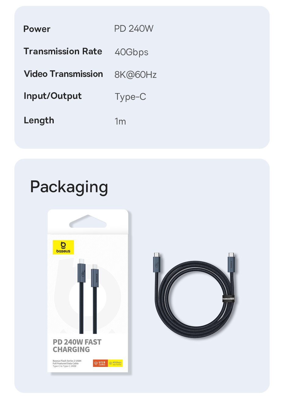 | Tên | Cáp Sạc Nhanh Truyền Dữ Liệu Baseus Flash Series 2 USB4 Full Featured Data Cable Type-C to Type-C 240W |
