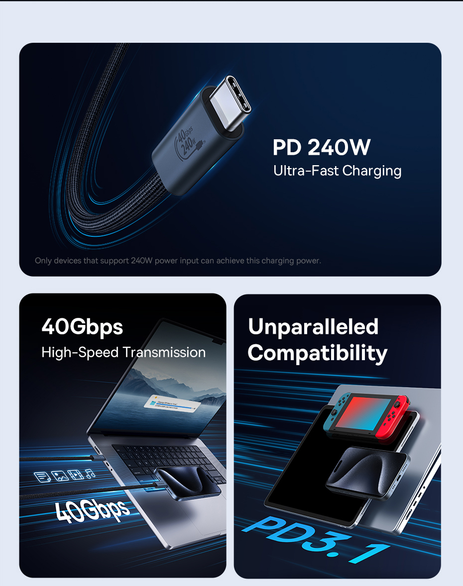 ⚡ SẠC SIÊU TỐC 240W PD 3.1 - SỨC MẠNH VÔ ĐỊCH: Trang bị chuẩn Power Delivery 3.1 mới nhất, cáp có thể cung cấp công suất sạc lên đến 240W, đủ sức nạp đầy năng lượng cho cả những chiếc laptop gaming, máy trạm đồ họa ngốn điện nhất một cách nhanh chóng.