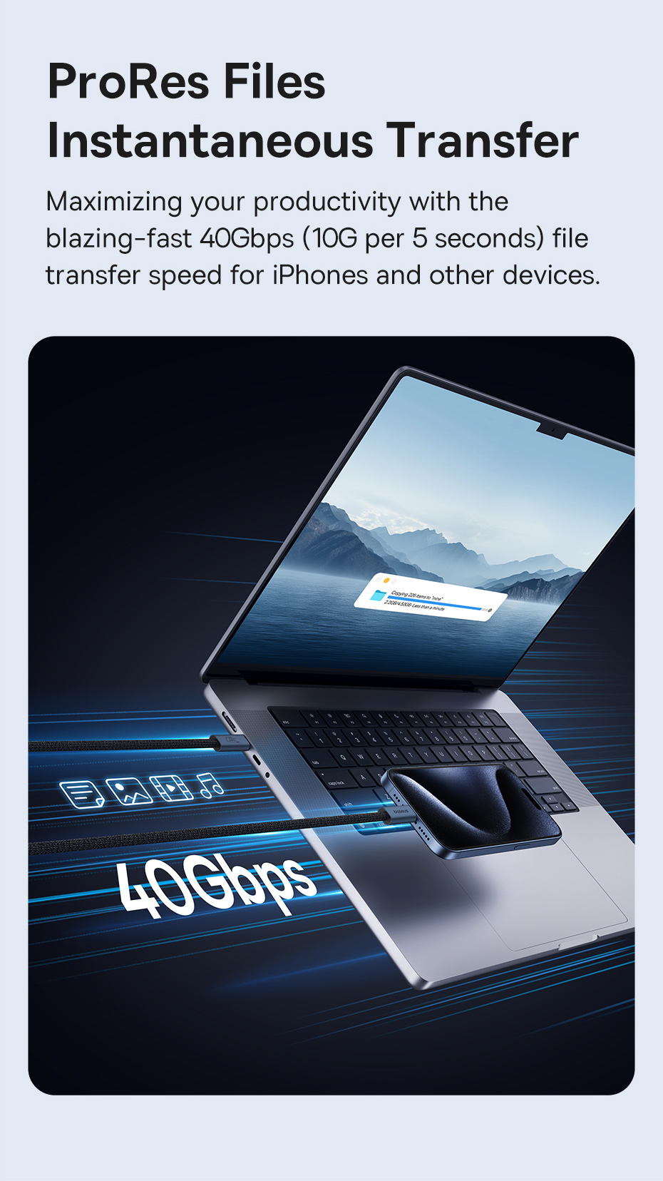 📁 TRUYỀN DỮ LIỆU 40Gbps - TỐC ĐỘ "ÁNH SÁNG": Với tốc độ truyền tải lên đến 40Gbps, việc sao chép các tệp video 4K, 8K dung lượng hàng chục Gigabyte chỉ mất vài giây. Một công cụ không thể thiếu cho các nhà sáng tạo nội dung, biên tập video và chuyên gia IT.