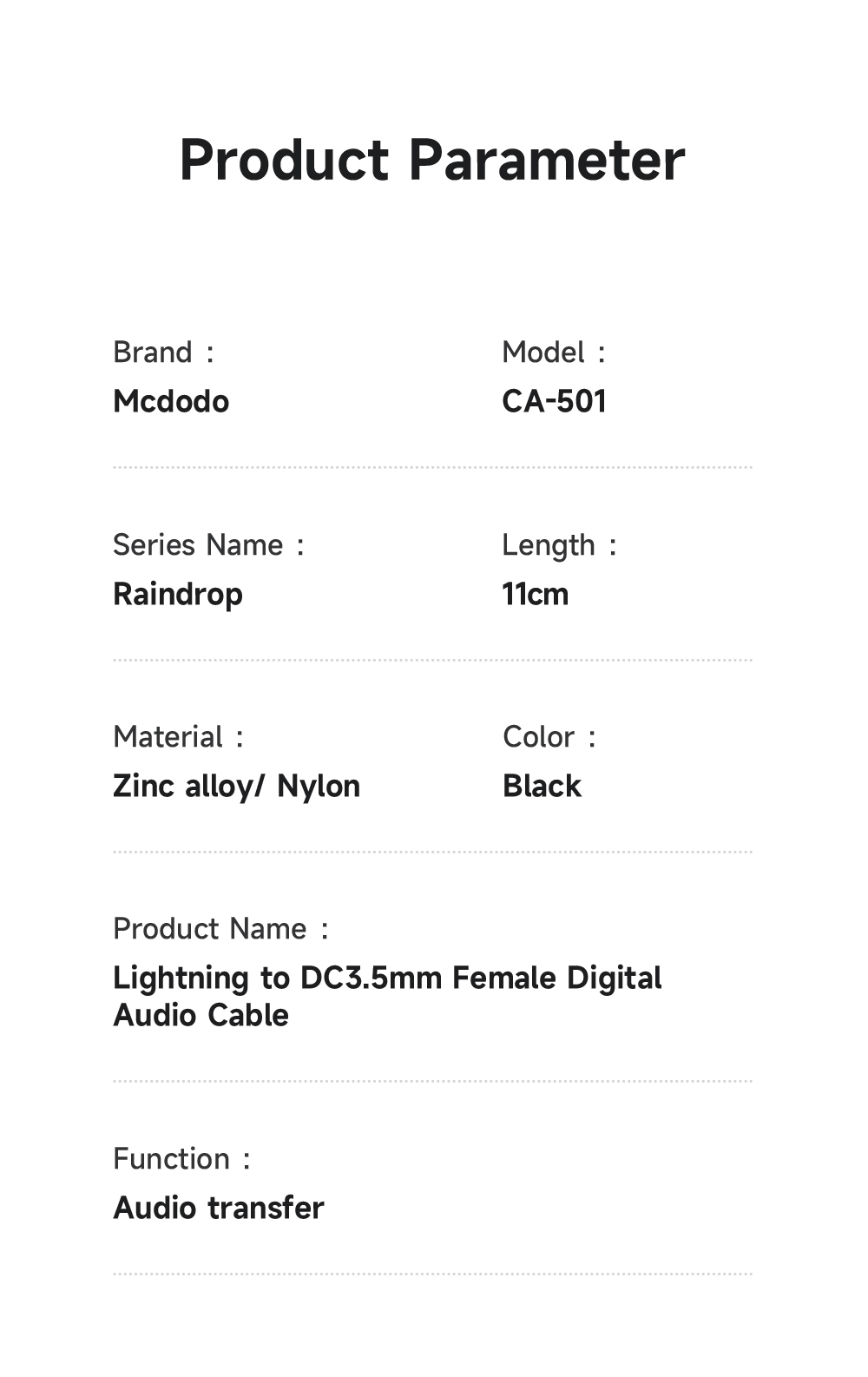 | Tên | Đầu Chuyển iP Sang Audio 3.5mm Mcdodo Raindrops Series iP to DC3.5 Female (11cm) |