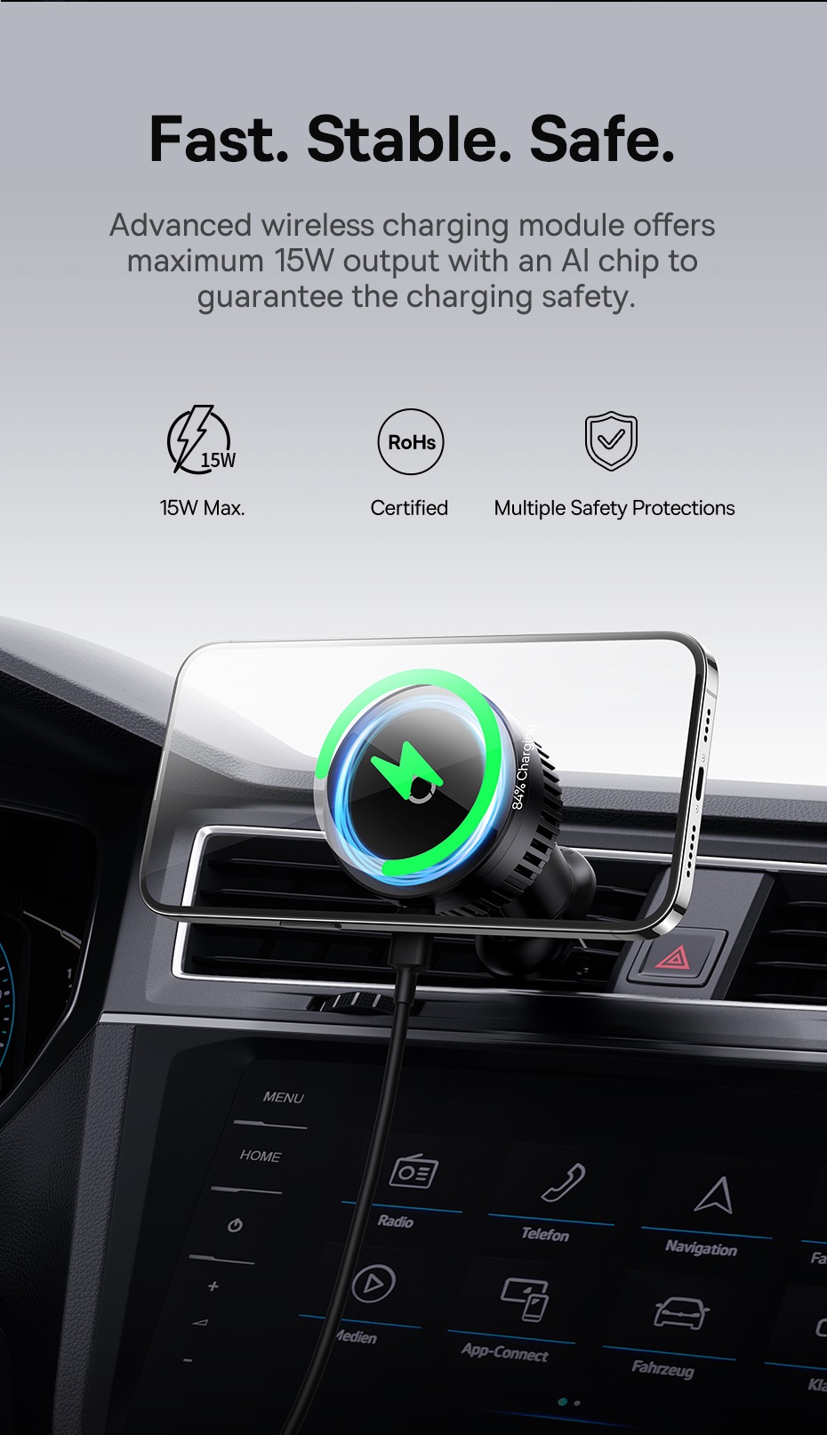 🔄 XOAY 360° & ĐẶT VÀO LÀ SẠC: Thao tác một tay cực kỳ đơn giản. Chỉ cần đưa điện thoại lại gần, lực hút nam châm sẽ tự động căn chỉnh và giữ máy đúng vị trí sạc. Khớp xoay 360° linh hoạt cho phép bạn dễ dàng chuyển đổi giữa màn hình dọc (xem thông báo) và ngang (xem bản đồ).