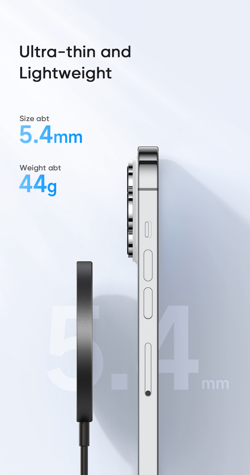🤏 Thiết Kế Siêu Mỏng, Gọn Nhẹ Vượt Trội: Với độ mỏng chỉ khoảng 5.4mm và trọng lượng khoảng 44g, đế sạc cực kỳ nhỏ gọn và tinh tế. Dễ dàng mang theo bên mình hoặc đặt trên bàn làm việc mà không chiếm diện tích.