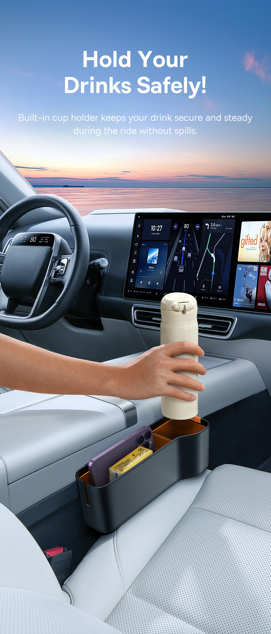 Tích Hợp Khay Đựng Ly: Giữ chai nước, ly cà phê một cách chắc chắn.