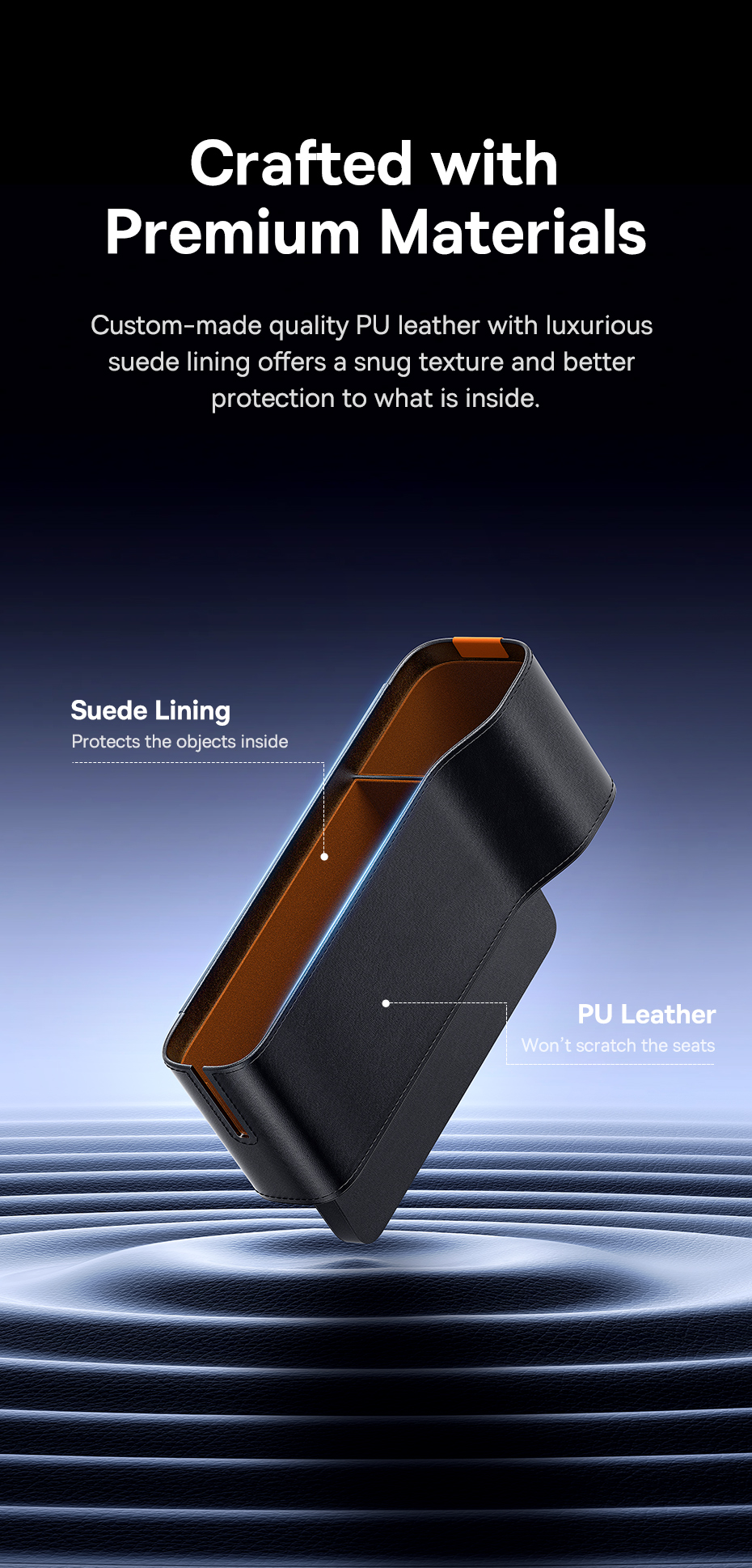 💎 CHẤT LIỆU DA PU CAO CẤP: Bề mặt được bọc da PU chất lượng cao với các đường may tinh tế, mang lại vẻ ngoài sang trọng và hài hòa với nội thất xe. Lớp lót bằng vải nỉ mềm mại bên trong giúp bảo vệ đồ vật khỏi trầy xước.