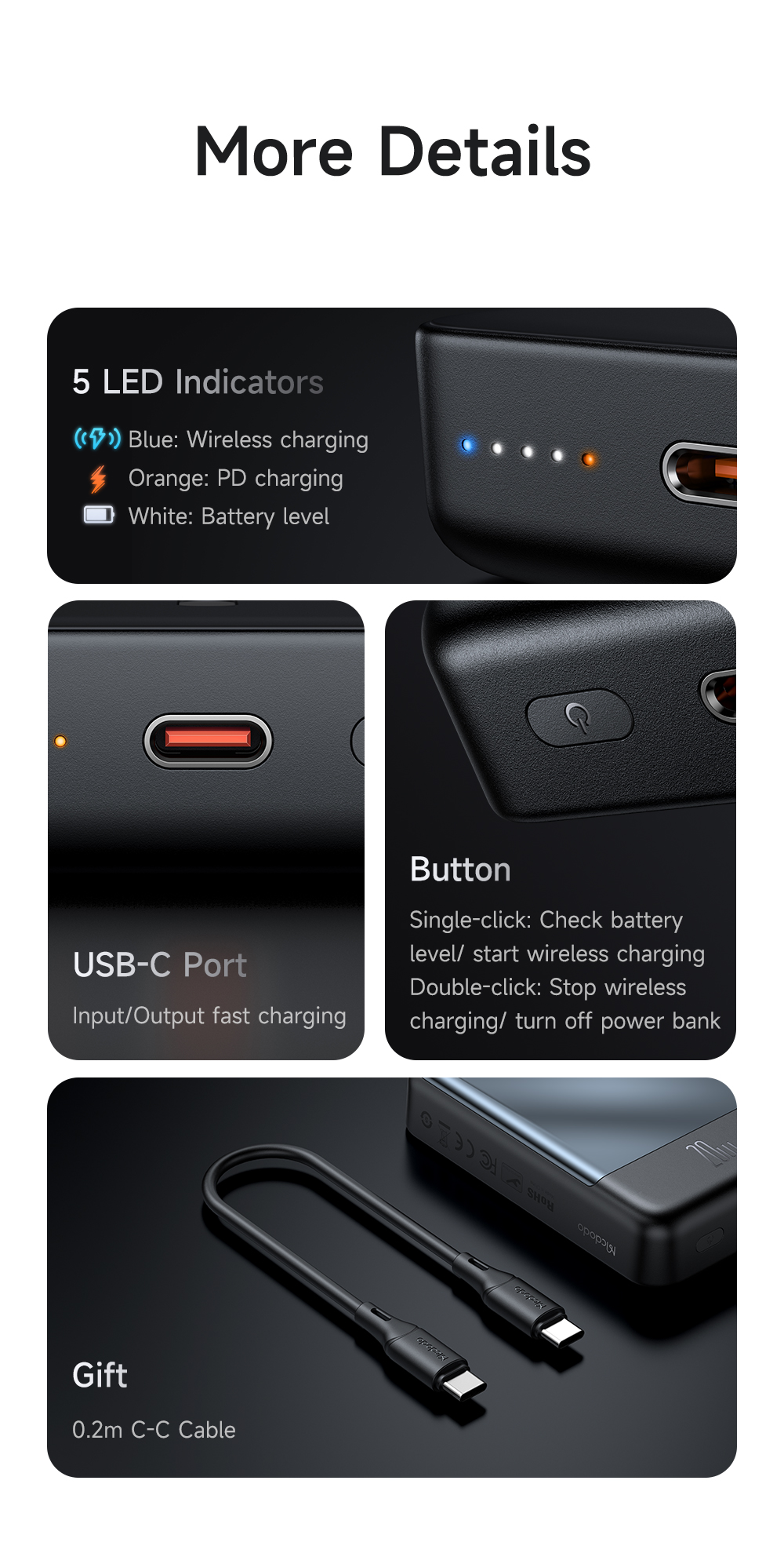 ⚡ SẠC NHANH LINH HOẠT - CÓ DÂY & KHÔNG DÂY: Cung cấp 2 lựa chọn sạc nhanh tiện lợi: sạc không dây từ tính công suất lên đến 15W và sạc có dây qua cổng Type-C chuẩn PD 20W, giúp bạn nạp đầy năng lượng cho thiết bị một cách linh hoạt và nhanh chóng.