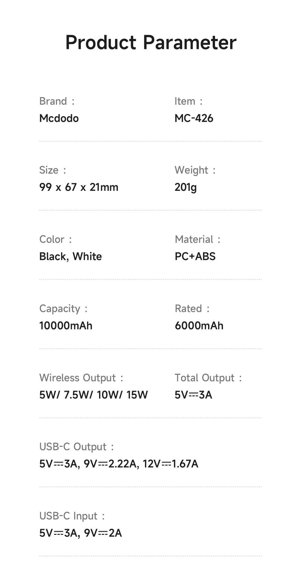 | Type-C Output | 5V-3A, 9V-2.22A, 12V-1.67A |