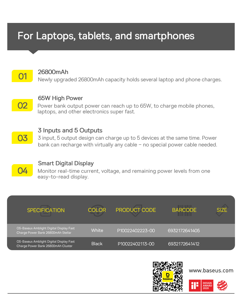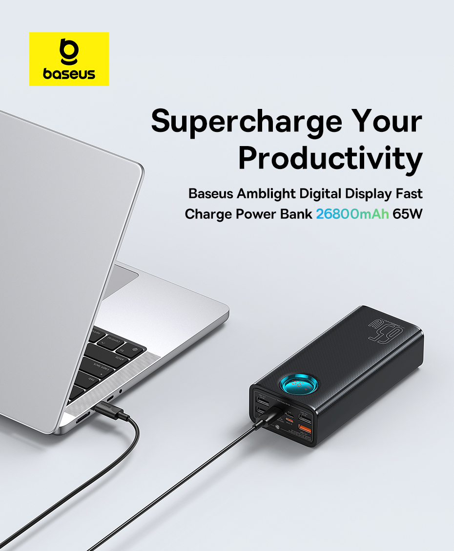 Bạn đang tìm kiếm một viên pin dự phòng duy nhất đủ sức mạnh để sạc cho TẤT CẢ các thiết bị của mình, kể cả laptop? Baseus Amblight 65W 26800mAh chính là câu trả lời. Với công suất đầu ra 65W chuẩn sạc laptop, dung lượng siêu khủng và màn hình hiển thị thông minh, đây là nguồn năng lượng dự phòng toàn diện nhất cho công việc và giải trí.