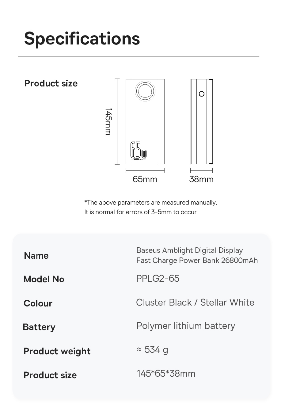 | Type-C Output | 5V-3A, 9V-3A, 12V-3A, 15V-3A, 20V-3.25A |