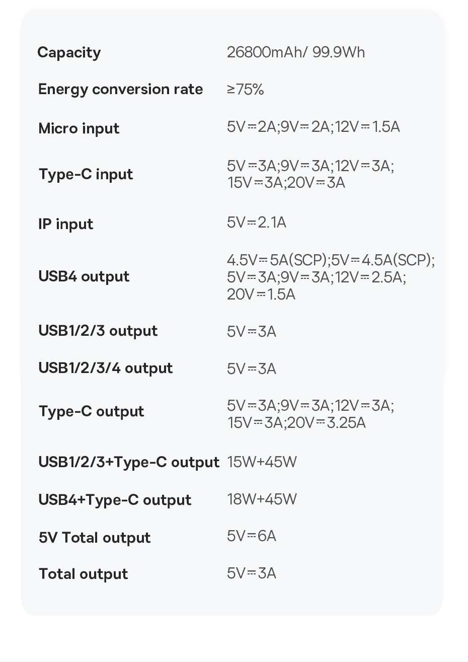| USB4 Output | 4.5V-5A (SCP) 5V-4.5A (SCP), 5V-3A, 9V-3A, 12V-2.5A, 20V-1.5A |