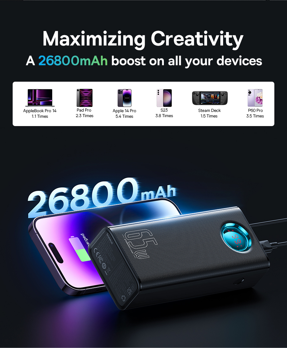 🔋 DUNG LƯỢNG SIÊU KHỦNG 26800MAH: Mang theo năng lượng cho nhiều ngày làm việc. Sạc đầy laptop khoảng 1.1 lần, iP14 Pro hơn 5 lần. Bạn có thể tự tin làm việc, giải trí mà không bao giờ phải lo lắng về việc hết pin giữa chừng.