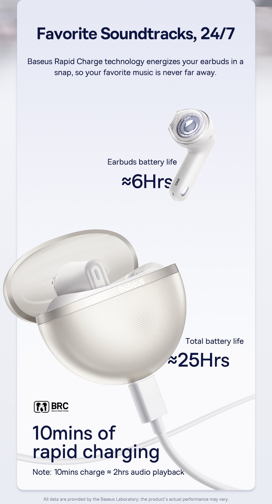 ○ Thời lượng pin: Lên đến 25 giờ (6 giờ cho tai nghe, 19 giờ từ hộp sạc).