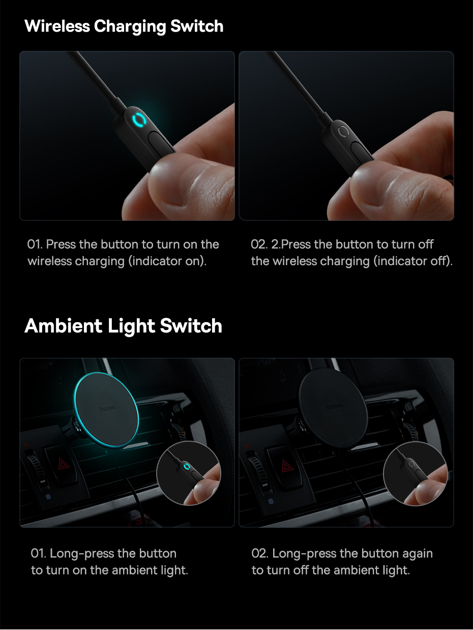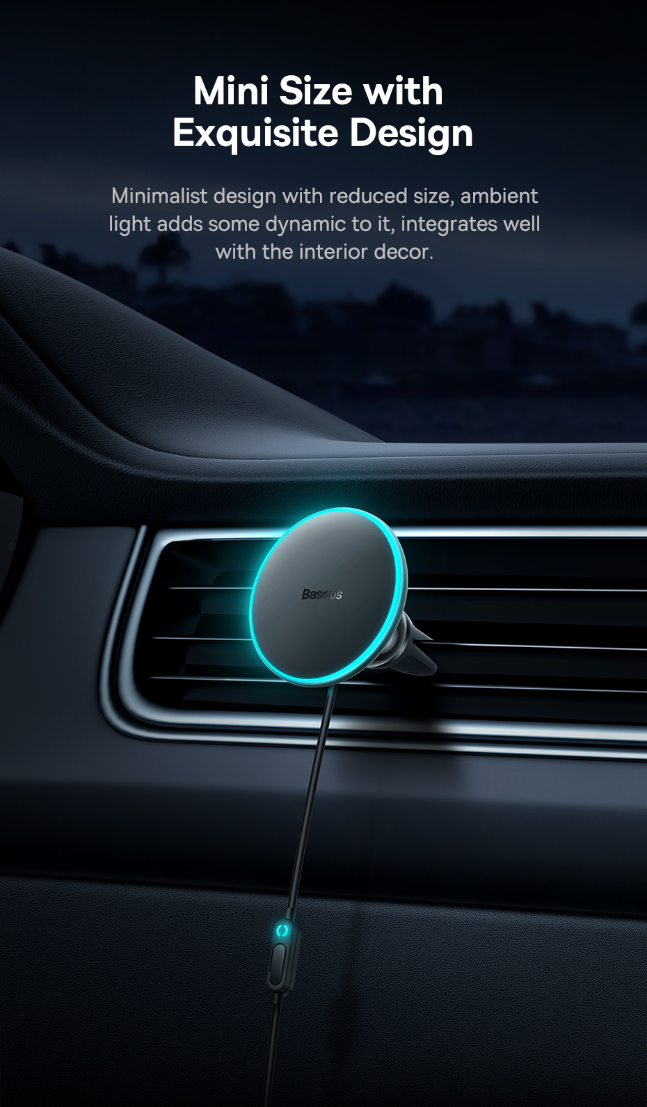 ✨ ĐÈN LED AMBIENT TINH TẾ: Vòng đèn LED xanh dịu nhẹ xung quanh đế sạc không chỉ tạo điểm nhấn sang trọng cho nội thất xe mà còn giúp bạn dễ dàng đặt điện thoại vào đúng vị trí trong điều kiện trời tối.