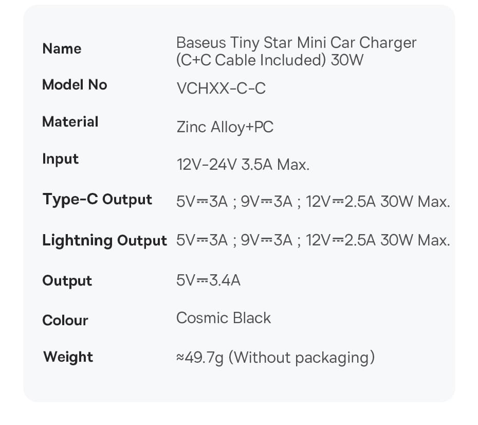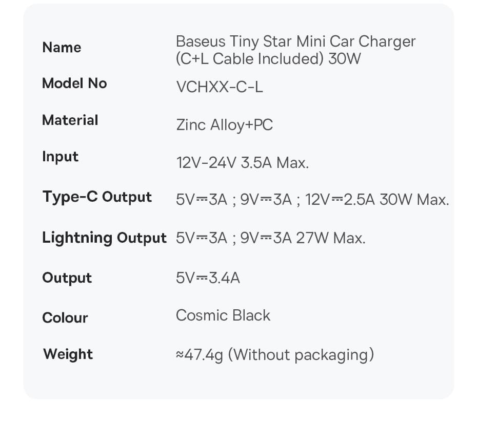 | Tên | Tẩu Sạc Nhanh Kèm Cáp Sạc Baseus Tiny Star Mini Car Charger Type-C 30W |