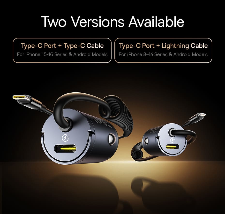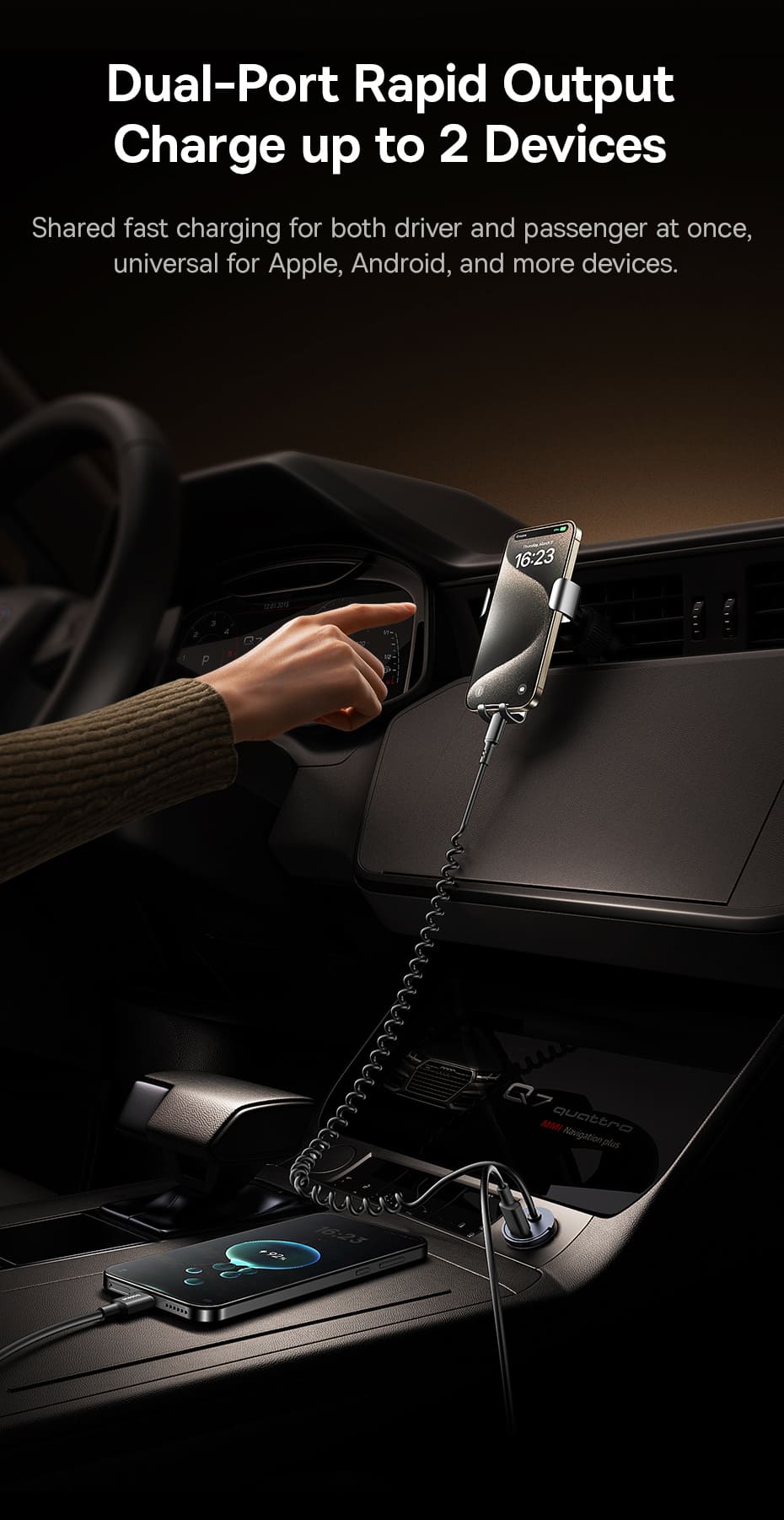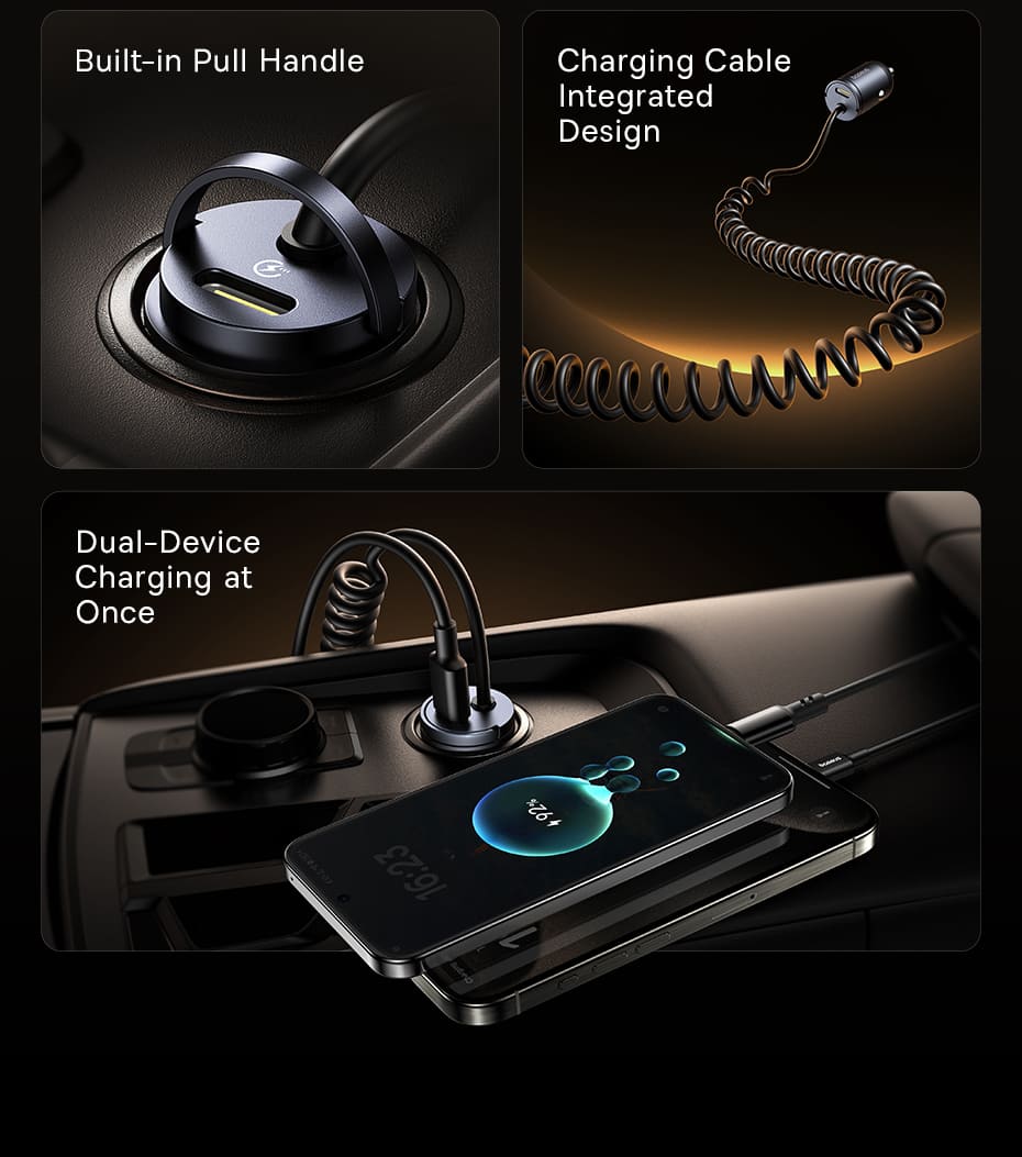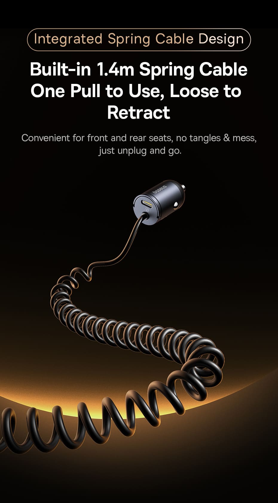 🔌 CÁP LÒ XO TÍCH HỢP - GỌN GÀNG & TIỆN LỢI: Không bao giờ quên dây sạc nữa! Cáp lò xo tích hợp sẵn dài đến 1.4m, vừa đủ để vươn tới hàng ghế sau nhưng vẫn tự động co lại gọn gàng khi không sử dụng, giữ cho xe của bạn luôn ngăn nắp.